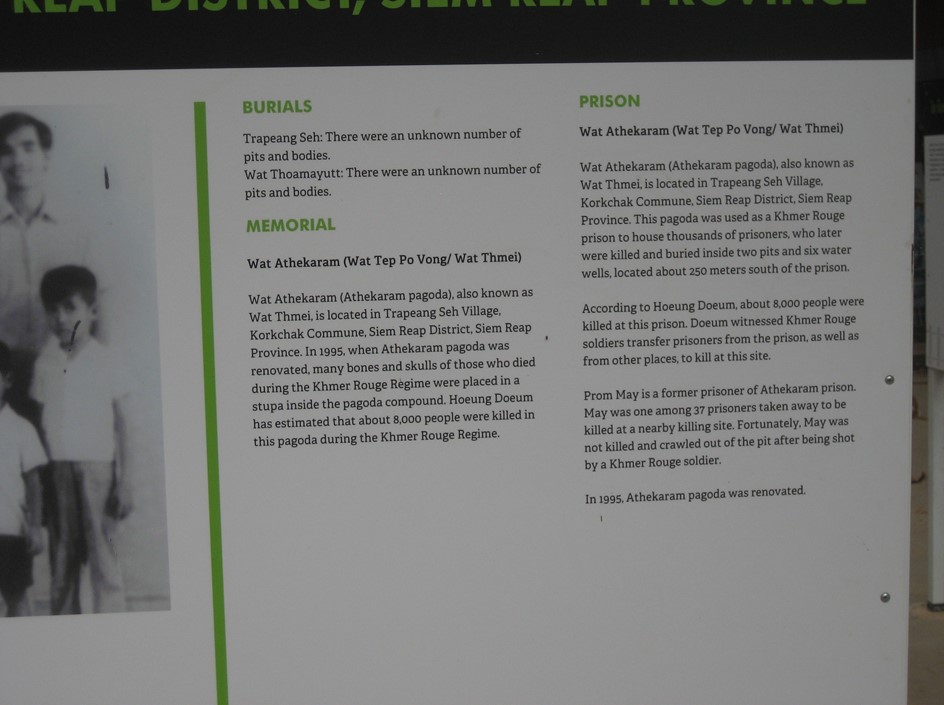 The Khmer Rouge were overthrown by the Vietnamese in 1979. When the monks were allowed to return, they found mass graves of murdered people. The bones are collected in some of these display cases.